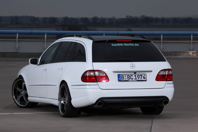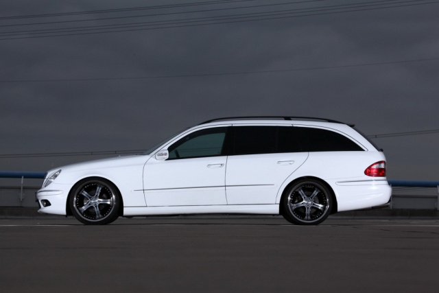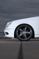 Extra breite Pirelli-Pneus verhelfen der E-Klasse zu einem stämmigen Auftritt. Ein H&R-Gewindefahrwerk legt die Vorderachse tiefer, während sich Radeisen-Motorsport um die luftgefederte Hinterachse kümmerte. Schlussendlich sorgt eine Burdinski-Abgasanlage für einen guten Ton und ein AMG-Bodykit verschönert die Optik des E-Klasse Mercedes.