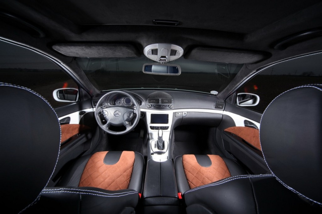 Für die optische Umgestaltung des Interieurs griff die hauseigene Sattlerei zu Alcantara und Leder und veredelte Sitze, Türverkleidungen, Himmel und Rücksitzbank. Rautenförmige Absteppungen und weiße Ziernähte verdeutlichen den gehobenen Anspruch, während weiße Applikationen an Türen und Mittelkonsole den Bezug zur Außenhaut des Mercedes herstellen.