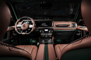 Das Exterieur wird durch den „Performmaster Carbon Fibre Body Kit“ eindrucksvoll ergänzt: Mit markanten Radkästen, aggressiv gestalteten Stoßfängern vorn und hinten sowie breiten Seitenschwellern bekommt die G-Klasse eine noch muskulösere Silhouette. Das Carbon-Dach und die passende Reserveradabdeckung setzen weitere exklusive Akzente.