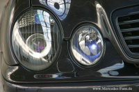 Um die schwarzen Xenon Scheinwerfer einer E-Klasse zu integrieren, mussten die vorderen Kotflügel leicht ausgestellt und seitliche Streben vom Kühler entfernt werden. Die Frontschürze entstand in Eigenregie. Der obere Bereich ist original, der untere dagegen von einer C-Klasse W203. In diese kamen insgesamt vier Nebenscheinwerfer mit trendigen Angel Eyes und dementsprechend angepasste Gittereinsätze. Frontgrill und Heckleuchten bekamen abschließend einen schwarzen Hauch von Lack zu spüren.