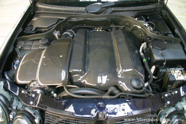 Sonstiges: Frontschürze von CLK AMG und C-Klasse W203, schwarze E-Klasse Xenon-Scheinwerfer, schwarzer AMG Grill, 4 Nebelscheinwerfer im Angel Eye Design, vierfach LED Standlicht, neue Alugitter gebaut, getönte Rückleuchten, Seitenschweller und Heckschürze original AMG, Unterbodenbeleuchtung, Lackierung: designo Panther schwarz metallic, Carbonabdeckung über Kompressor