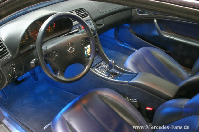 Interieur: Blaues Vogelaugen-Ahorn (AMG Design), designo Schaltknauf, zweifarbige Lederausstattung, blaue Fußraumbeleuchtung, Telefon in Mittelkonsole, Comand System mit TFT Monitor und sechsfach CD Wechsler, Emphaser Verstärker und Subwoofer, DVD Player von Boss und Bose Soundsystem