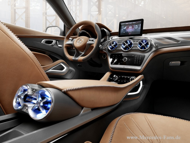 Das Interieur reiht sich gestalterisch in die Familie der neuen kompakten Mercedes Modelle ein, jedoch neu interpretiert als moderner und äußerst hochwertiger SUV. Dabei dominieren Leder und dunkel galvanisiertes Aluminium und bilden einen spannenden Kontrast. Die vier Einzelsitze und die Türmittelfelder sind mit kräftigem braunem Naturleder bezogen. Nicht nur die Farbe erinnert an Sättel, sondern auch die Verarbeitung: Insgesamt finden sich im Concept GLA über 20 Meter von Hand verarbeitete Nähte, sie halten die offenen Lederkanten zusammen.