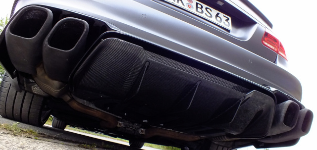 Selbst im Ruhemodus siehst man dem Mercedes seine urgewaltigen Potentiale an. Der effektvolle Eindruck ist selbstredend vor allem dem AMG-Karosserie-Kleid zu verdanken. Aufgrund markanter Stoßfänger und üppig proportionierter Seitenschwellerleisten pflegt der W212 eine betont dynamische (Form-)Sprache. Ergänzend kommt ein Carbon-Heckdiffusor aus dem Hause RENNtech hinzu. Ebenfalls dem RENNtech-Programm entstammen die Endrohrblenden für die ab Kat montierte Abgasanlage von MEC-Design.