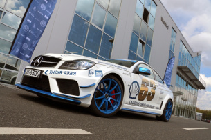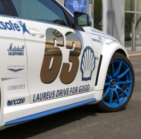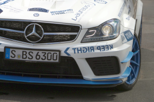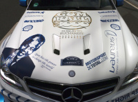 Der weiße C63 AMG Black Series kommt wie alle Gumball 3000 Rallye Fahrzeuge in einer auffälligen Optik mit zahlreichen Sponsoren-Logos und Rennnummer daher. Unter der auffälligen Optik steckt ein nahezu serienmäßiges Mercedes-Benz Coupé, das in der Laureus-Optik weiß mit blauen Akzenten an Spiegeln, den zusätzlich montierten Winglets und Heckspoiler sowie den 19"-AMG-Felgen erscheint.