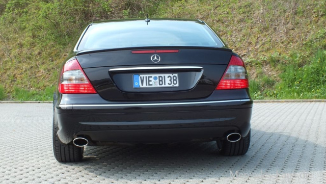Darüber hinaus werten der Grill im AMG-Look und Carbon-Spiegelkappen das Erscheinungsbild des Mercedes E270 prägnant auf. Die Rückansicht profitiert - in Ergänzung zu dem bereits erwähnten AMG-Stoßfänger - von der draufgesattelten Abrisskante, den Mopf-Rückleuchten und den zwei AMG-Endrohren des Styling-Pakets.
