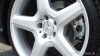 Ein H&R-Gewinde beordert die schwarz lackierte Karosserie um 40/35 mm Richtung Asphalt. Zudem bestückt Harun die Achsen mit Spurplatten (je 10 mm vorne und je 15 mm hinten). Durch diese Maßnahme werden die mit Continental-Reifen kombinierten 20-Zoll-Felgen (AMG-Styling 3) ein gutes Stück nach außen gedrängelt. Tieferlegung und Spurverbreiterung setzen den Mercedes richtig stark in Szene.
