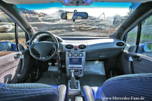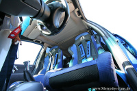Innenraum: Armaturenbrett in Mondsilber Metallic lackiert, Raid Silberpfeil Lenkrad, Instrumente blau beleuchtet und chromumrandet, Chromschaltknauf mit blau beleuchteter Schaltgrafik, Carlsson Handbremshebel, Chrom Lüftungsregler FK Halbschalensitze, elektrische Schroth Hosenträgergurte, Alu-Pedale vom A210 Evo, beleuchtete AMG Einstiegsleisten,