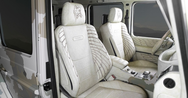 Mehr drin hat die SAHARA Edition auch im Innenraum. Bei Mansory geht Leder über alles. Aber nur von der Allerfeinsten Sorte. Armaturenbrett und Mittelkonsole lassen sich nicht nur im tierischen Leder-, sondern auch in einem neuen Look blicken. Zu den Besonderheiten der inneren Werten zählen Falken-Motiv-Stickereien sowie Camouflage-Optik des beige/grauen Leders.