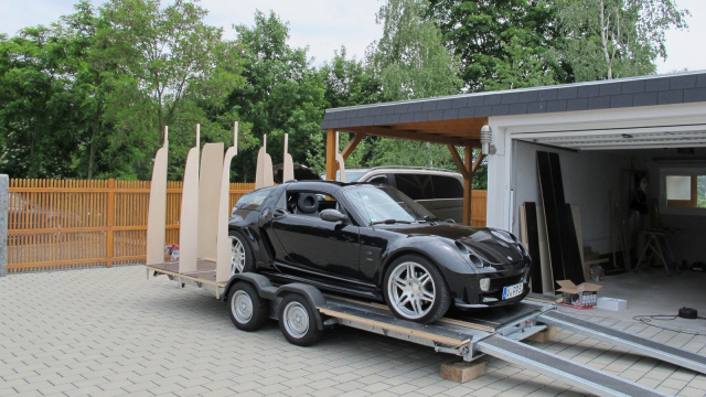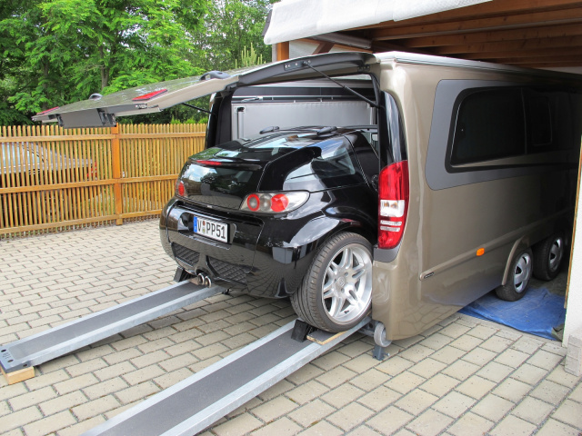 "Vor 4 Jahren schaffte ich mir einen Mercedes-Benz Viano an. Ich wollte den Van u.a. für Urlaubsreisen nutzen. Ein Viano in der Marco Polo- Version als Campmobil wäre eigentlich dafür perfekt gewesen, aber der Anschaffungspreis ist ja nicht ganz ohne. Dazu kam, dass man natürlich immer die Campingausstattung im Alltagsbetrieb mit an Bord hat. Darum entschied ich mich dann für einen Mercedes-Benz Viano in der Standardversion. Für die geplanten Reisen baute ich ein Küchenmodul, Staumodul und eine Liegefläche ein. Mit einem passenden Busvorzelt hatte ich dann mein Campmobil. Die erste Reise damit führte uns in die Schweiz, weitere Reisen damit nach Österreich und Südtirol. Wie man aus den Reisezielen erkennen kann, lieben wir die Alpen. Auch eine Urlaubsreise mit meinem kleinen Cabrio, ein Smart Roadster Brabus führte uns in die Alpen. Mit diesem Cabrio auf den Hochalpenstraßen zu fahren, ist einfach genial! Das Problem ist leidier, dass die 400 Kilometer lange Anfahrt von meinen Wohnort ins Hochgebirge im smart für uns etwas zu strapaziös ist. Die Frage war: Wie lässt sich komfortables Campen mit dem Viano und smart-Fahrspaß miteinander verbinden? Das brachte mich nun auf die Idee, auf der Basis eines PKW-Transportanhängers, einen Trailer zu bauen, mit dem sich der smart auf Reisen mitnehmen kann und der als Wohnwagen nutzen kann"
