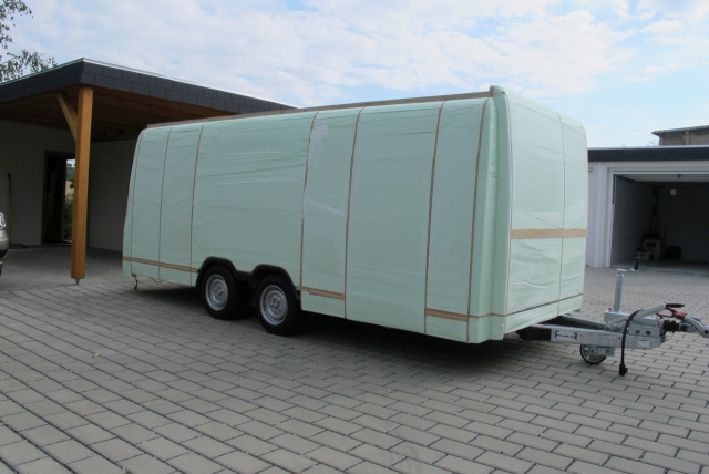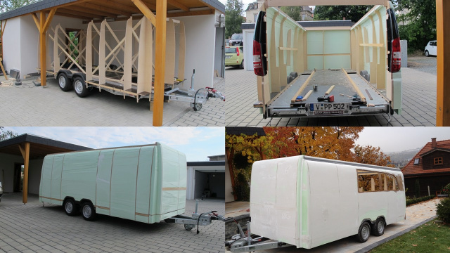 „Die Basis für den Wohnwagenaufbau war in Form eines doppelachsigen PKW-Trailers der engl. Firma Brain James bald gefunden. Man hätte relativ einfach einen Aufbau mit GFK-Sandwichplatten realisieren können, doch dann hätte man eben nur einen mehr oder weniger rechteckigen Kastenaufbau. Mein Ziel war es aber, einen Aufbau zu realisieren, der zur Zugmaschine, dem Viano, auch optisch passt. Von der Höhe wollte ich nicht wesentlich höher gehen wie das Zugfahrzeug, um keine „Schrankwand“ hinterher ziehen zu müssen. Deshalb sollte das Dach in der Höhe verstellbar sein, um im Inneren genügend Stehhöhe zu besitzen“