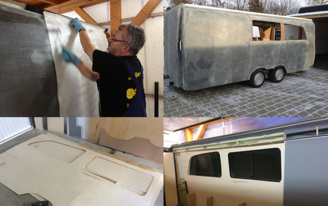 „Dieser Rohbau wurde dann mittels GFK-Technik laminiert. Ein Schichtaufbau mit Epoxidharz und Glasfasergewebe, verlieh der Konstruktion die nötige Stabilität. Man musste darauf achten, möglichst sauber zu arbeiten, denn alle Unebenheiten mussten ja später durch Spachten und Schleifen geglättet werden. Als Seitenfenster sah ich die Originalscheiben vom Viano vor. Die Ausschnitte dafür wurden in MDF-Platten eingearbeitet, die dann ebenfalls mit GFK laminiert wurden. Die Heckklappe wurde ähnlich wie die Seitenwände hergestellt. Das Dach wurde auf einer Unterkonstruktion aus Aluprofil ebenfalls in GFK-Technik gefertigt. Im Frühjahr 2015 war dann der Rohbau fertig.“
