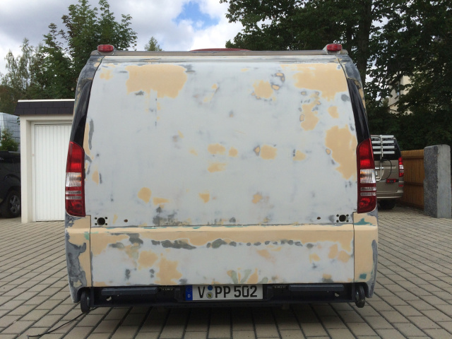 „Jetzt konnten die Vorbereitung für die Lackierung beginnen. Obwohl ich versucht hatte beim Laminieren so sauber wie möglich zu arbeiten, war noch jede Menge an Spachtel- und Schleifarbeit zu erledigen, um eine ordentliche Oberfläche zu erhalten.Die Lackierarbeiten wurden durch eine professionelle Lackiererei ausgeführt. Als Kolorit für den Wohnwagen wurde der Farbton des Mercedes-Benz Viano gewählt.“