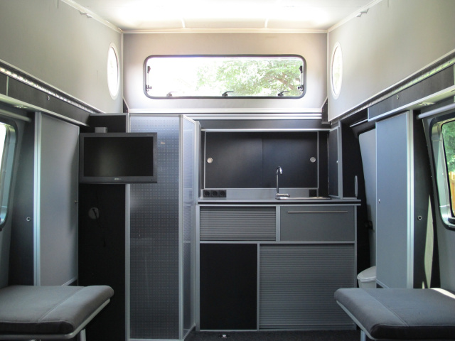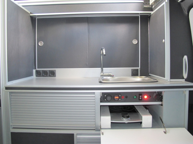 „Im Frontbereich des Wagens wurde eine kleine Küchenzeile mit Kühlbox und Spülbecken installiert. Daneben eine Waschmöglichkeit und eine Toilette. Die Toilette und die Kühlbox sind in der Schrankzeile untergebracht und bedarfsweise herausfahrbar. Im Stauraum unter den Boden, wurden ein Frischwassertank und ein Abwassertank angebracht. Die Verkleidung der Wandflächen wurde mit 3mm Pappelsperrholz, das mit Kunstleder bezogen wurde vorgenommen. Staufächer wurden seitlich angebracht. Dabei musste beachtet werden, dass natürlich noch genug Platz für das Cabrio bleibt. Deshalb auch die Betten seitlich klappbar, ebenfalls die Sitzhocker.“