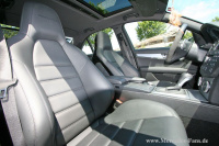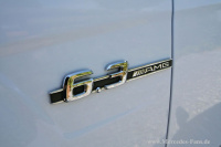 Das in Tenoritgrau-Metallic ausgelieferte Neufahrzeug erhielt eine Folienbeklebung im trendigen Weiss. Für den Fall, dass die Farbe mal wieder aus der Mode kommen sollte, dauert es nur ein paar Stunden und der C63 erstrahlt wieder im (geschützten) Originallack. An dieser Stelle sei übrigens mal mit dem Irrtum aufgeräumt, eine Beklebung verursache nur einen Bruchteil der Kosten einer Neulackierung. Möchte man ein perfektes Endergebnis, welches vom Lackfinish nicht zu unterscheiden ist, begibt man sich schnell auch preislich in selbige Regionen. Das Dach, der Kühlergrill und der Spoiler erhielten einen kontrastierenden Carbonlook-Überzug.