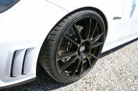 Wie schon erwähnt, konnte das AMG-Fahrwerk den Karosseriebaumeister nicht wirklich überzeugen. So tauschte er es gegen ein höhenverstellbares KW-Fahrwerk in der Variante 3 aus. Dank individuell justierbarer Zug- und Druckstufe lässt sich das Set-Up perfekt den eigenen Vorstellungen anpassen. Apropos Vorstellung: Driton hatte seine ganz eigene, was den Auftritt und die Räder seines Mercedes angeht. 8,5x20 Zoll messende O.Z. Ultraleggera hatten es ihm angetan. Bereift mit superflachen 235/30er Hankook Evo S1 Reifen steht der Wagen unglaublich bullig und kräftig auf der Strasse. Dank Aufhebung der Geschwindigkeitsbeschränkung läuft der Benz munter in Richtung 300 km/h-Marke. So schnell fahr ich aber nicht oft, der Reifen wegen, grinst Driton.