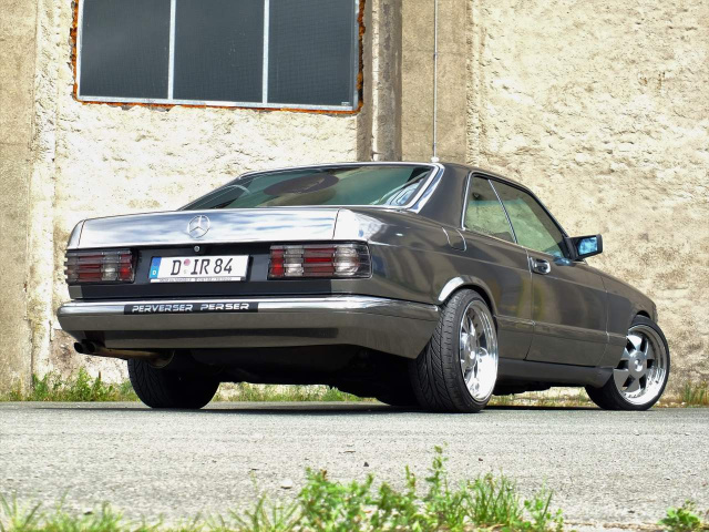 Zum starken Eindruck des Oberklasse Coupés gehört ein Sportrimm in der Machart der 80er Jahre. Dazu gehören neben der bereits erwähnten, kraftvoll klingenden Abgasanlage, getönte Beleuchtungseinrichtungen, MAE-Räder in 9,5 x 18 und 10,5 x 18, dicke Socken (255/40er vorn und 255/35er hinten), eine markante Spurverbreiterung von 20 mm / 25 mm vo/hi sowie eine sportliche Tieferlegung mittels H&R-Federn um rundum 40 mm.