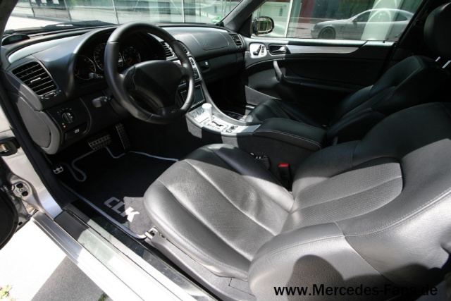 Innenraum: Innendekor in Wagenfarbe lackiert, SLK-Pedalauflagenm Chromringe im Tacho, Raid 340mm Silberpfeil-Lenkrad, Chrom-Schaltkulisse, Schaltknauf in Wagenfarbe lackiert, Veloursfussmatten mit CLK-Logo und Silberkeder, Mittelarmlehne und Türgriffe mit Leder bezogen und mit Silbernaht verziert, Chrom-Türpins, blau beleuchtete Einstiegsleisten aus Edelstahl, A-, B-, und C-Säulen und Himmel mit Alcantara bezogen, LED-Innenleuchten und Einstiegsbeleuchtung