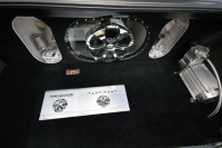 Die HiFi-Anlage wurde aus Komponenten der Firma DUB Mag zusammengestellt, und um Platz für die DUB 600C-Lautsprecher mit 16 cm Durchmesser zu schaffen, hat er die Fronttüren modifiziert. Im Kofferraum liegt noch eine 30 cm DUB 200-Bassröhre, die ich in einen Schaukasten eingelassen habe, in denen, passend zum Thema, einige Gangster-Objekte finden, die den Blick in den Kofferraum abrunden sollen, fährt er fort, Eine Zigarre, ein G-Unit-Feuerzeug, 50-Cent Stücke und eine Modellpistole., und man merkt, dass Peter nichts auslässt, um den Style perfekt zu machen.