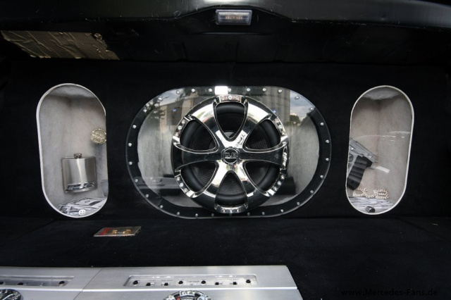 Aber zurück zur Technik, ermahnt er sich selbst, um sich nicht in den unzählbaren kleinen Detailänderungen zu verlieren, den Subwoofer habe ich an einen DUB 1004 Vier-Kanal-Amplifier im Bridge-Mode angeschlossen, die Lautsprecher in der Fahrgastzelle werden über einen DUB 1002 Amp separat angesprochen, und die Musik selbst spiele ich aus einem Pioneer P77 MP CD-Player ein erzählt der Ungar und schließt damit den eindrucksvoll dekorierten Kofferraum.