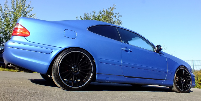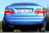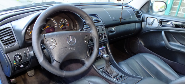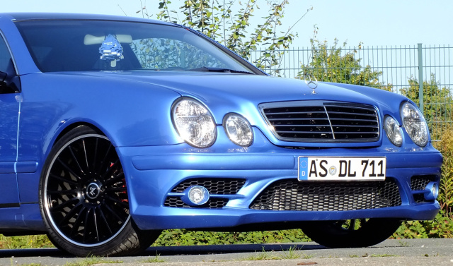 Mithilfe von AMG-Schürzen (C209 vorne und Sportpaket hinten), spiegelt das Erscheinungsbild den Zugewinn an Fahrdynamik zutreffend wider. Im besonderem Maße profitiert die Ausstrahlung des C208 aber natürlich von der Neulackierung im genialen Südseeblau-Metallic.