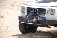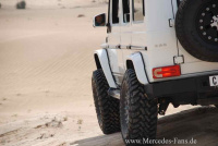 Die hier gezeigte G-Klasse fährt auf 2-teiligen 16 Zoll Hutchinson Beadlockfelgen die mit Reifen der Dimension 315/75/R16 ausgerüstet sind. Sie erlauben das Fahren im Gelände, speziell im Sand mit einem Luftdruck von weit unter einem Bar! Der in der Felge befindliche Beadlock Ring verhindert selbst bei völligem Luftverlust ein Abspringen des Reifens während der Fahrt.