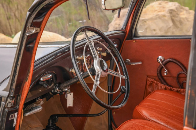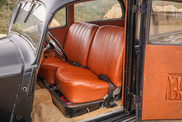 Das Dreispeichenlenkrad umrahmt einen mittig im Armaturenbrett angebrachten 120-km/h-Tachometer, eine Uhr und eine Kombiinstrumentanzeige für Öldruck und Kraftstoffstand. Auf dem Armaturenbrett werden 13.600 Meilen angezeigt, die Gesamtlaufleistung des Fahrgestells ist jedoch unbekannt.