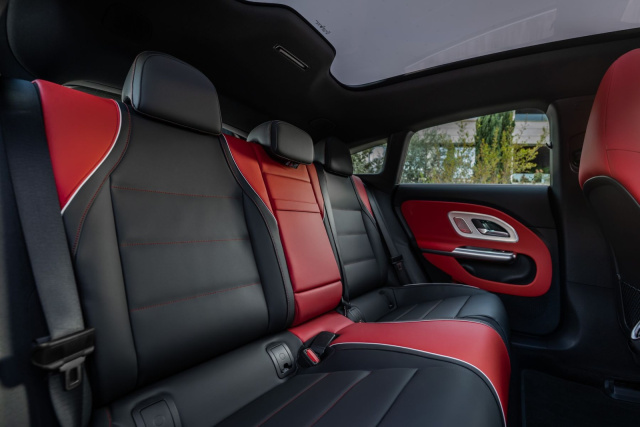Außerdem geht es in der zweiten Reihe dank der um 2,6 Zentimeter größeren Kopffreiheit etwas luftiger zu als in der CLA-Limousine. Das macht zwar noch keinen Van aus dem Shooting Brake, aber bei einer Körpergröße von 1,85 Metern freut man sich über jeden Zentimeter mehr Raum über dem Haupt. Zumal ein großes Panoramadach für angenehmes Licht im Innenraum sorgt. Gerade im Winter ein Stimmungsaufheller. Eine spezielle Beschichtung soll im Sommer das Aufheizen des Innenraums verhindern. Außerdem sind 158 Sterne in die Glasfläche integriert. Da summt man doch unwillkürlich Hubert Kahs 1980er-Jahre-Hit „Ich seh‘ den Sternenhimmel“. Ein weiterer Vorteil des Shooting Brakes sind die weiter aufschwingenden Türen, die das Entern des Fonds erleichtern.
