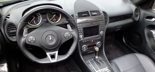 Der Innenraum spiegelt den Sportsgeist, der den Mercedes SLK 55 AMG beseelt, wider. In der Architektur schnörkellos klar strukturiert und zudem mit großen gut ablesbaren Anzeigen instrumentiert, fokussiert das Kabinen-Design die Aufmerksamkeit auf das Wesentliche. Unterstützt vom griffigen Sportlenkrad mit seinen Schaltpaddels zur Befehlsübermittlung an das 7G-Tronic-Getriebe und dem straffen Gestühl, kommt bei Fahrer und Co-Pilot unweigerlich zünftiges Roadster-Feeling auf.