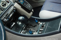 Um Aussteigen zu können, muss man jedoch erst einmal Platz nehmen. Im Innenraum erspäht das Auge sogleich die individualisierten Fussmatten mit den Initialen des Besitzers. Blaue Schroth-Automatikgurte legen sich über die originalen Sitze. Die Interieurbeleuchtung baute Patrick auf blaues Licht um. Ein Audiovox Receiver mit DVD Player und ausfahrbarem Touchscreen ersetzt das originale Radio. Das fest eingebaute TomTom Navi weist ihm den Weg (nicht nur) zu den Mercedes Treffen der Saison.