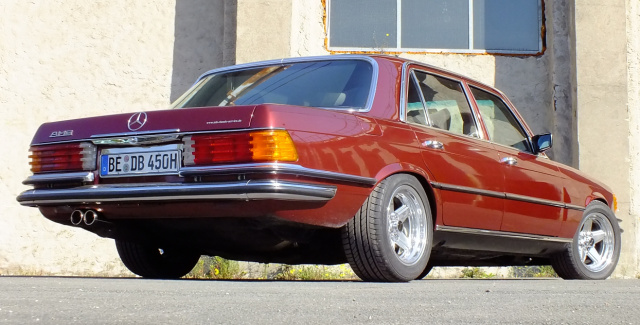 Den stimmigen Sport-Style jener Epoche repräsentiert Franks Mercedes 450 SEL, der mit Alu-Felgen und einer kompletten Abgasanlage von AMG aufwartet. Lorinser-Federn legen die metallic-rote Karosserie um satte 60/60 mm tiefer.
