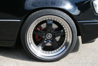Außerdem präzisieren edle Löwenhart-Felgen die sportliche Aussagen des Mercedes C124. Zur optischen Harmonisierung ließ Bernd Sauerland den Felgenstern mittels Glasurit-Lack in Schwarz finishen. Zugleich bereichern polierte Betten stimmig das zwar sparsam, aber dennoch effektvoll geschnürrte Zierrat-Paket.
