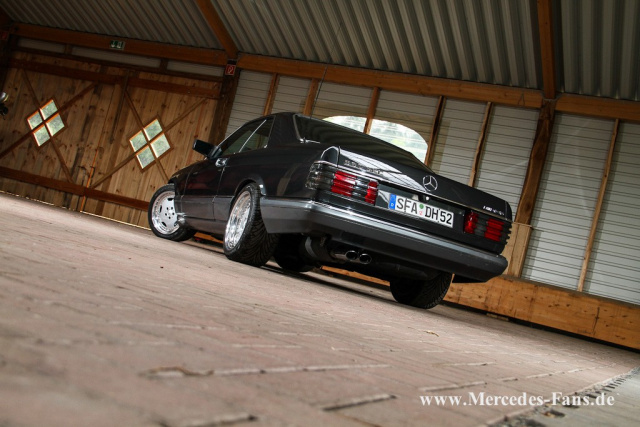 Gegen den etwas hochbeinigen Look seines frisch erworbenen Coupés hatte der Vorbesitzer berechtigte Einwände gehabt und auch gleich die passende Lösung parat. Die originalen Stoßdämpfer wurden mit 45mm Jamex Tieferlegungsfedern kombiniert. Dirk gefiel jedoch die flache Optik in Verbindung mit den 16 Zoll Rädern nicht. Daher montierte er 8x17 Zoll messende AMG-Felgen an der Vorder- und 10,5 Zoll breite Räder an der Antriebsachse. Goodyear Pneus in 235, respektive 255mm Breite sorgen für die nötige Verzahnung mit der Straßenoberfläche.