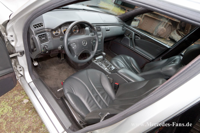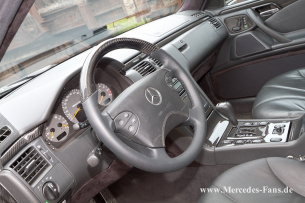 Innenraum: Voll-Leder schwarz, W210 AMG-Lenkrad mit neuen Tasten und oberem Kranz in Echtcarbon laminiert, Echtcarbon-Cockpitblenden, Verkleidungen und Dachhimmel mit schwarzem Alcantara-Bezug