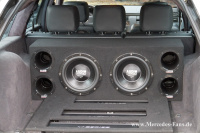 Damit die ganze Dämmerei auch einen runden Abschluß bekommt, baute Michael eine recht umfangreiche Sound-Anlage in sein AMG-befeuertes T-Modell. Ein Clarion NX 700e Multimedia-Naviceiver dient dabei als üppig dimensionierte Schaltzentrale. In den Türen sitzen Jehnert Doorboards mit jeweils einem Lautsprecher-Quartett. Drei Audio System Endstufen machen es sich im Kofferraum gemütlich und produzieren reichlich Leistung um die beiden im maßgefertigten Gehäuse sitzenden Krypton Subwoofer sowie die restlichen Chassis anzutreiben.