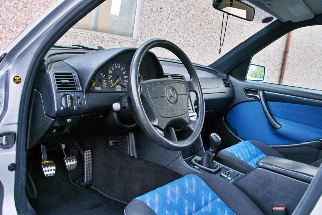 Der Motor des Mercedes-Benz C220 CDI läuft noch wie Flottchen. Die 125 PS, die der 2.151-ccm-Vierzylinder bereitstellt, reichen seinem Fahrer, dem im Innenraum Alu-Pedale zu Füßen liegen und die Gangwechsel mit einem Esprit-Schaltknauf einleitet, für ein komfortables Fortkommen und auch für die flottere Gangart aus. Mit dem Umstand, dass durch das Interieur noch der ursprüngliche Charme eines blauen Sitzbezugs mit einem nicht ganz topaktuellen Stoffmuster weht, hat sich Alex problemlos arrangiert. „Die Sitze werden von mir “Bus-Ausstattung“ genannt.“ Das passt ebenso gut, wie MIB zu seinem Mercedes W202 gehört.