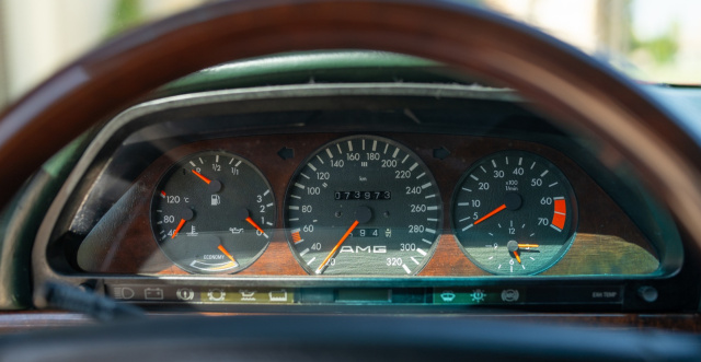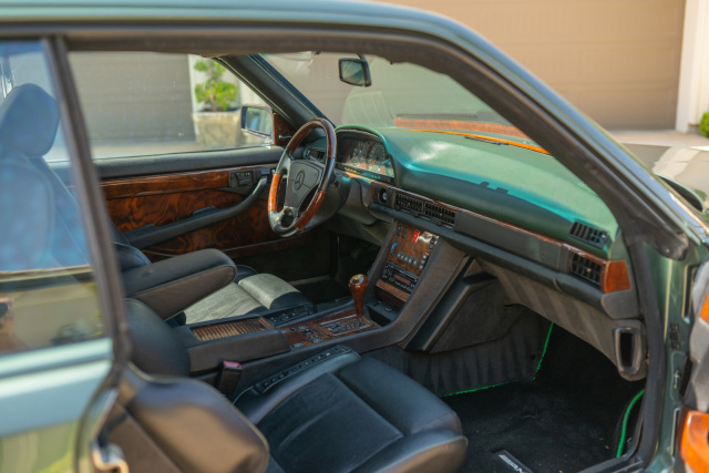 Der ursprüngliche Auftraggeber, ein japanischer Geschäftsmann, ließ auch im Innenraum keine Kompromisse zu. Jeder Quadratzentimeter wurde mit handgearbeitetem Büffelleder bezogen, teils in Schwarz, teils in dunklem Grün mit kontrastierenden Nähten. Sogar Bedienelemente wie Sitzverstellschalter erhielten eine Lederverkleidung. Ergänzt wurde das Interieur durch aufwendig gearbeitete Burlwood-Zierleisten, ein High-End-Soundsystem von Nakamichi sowie elektrisch verstellbare Recaro-Sitze. Für die Umsetzung dieser exklusiven Wünsche zog AMG renommierte Partner wie Carat Duchatelet hinzu, deren Expertise für Luxusausstattungen international geschätzt war.