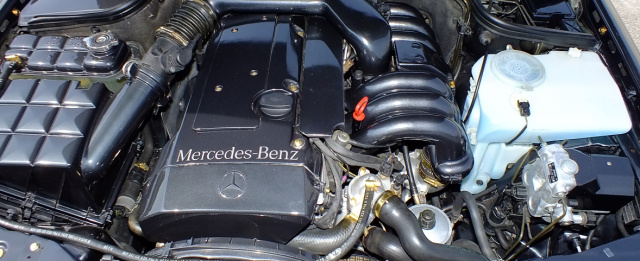 Motor: Sechszylinder-Motor und kompletter Antriebsstrang vom Mercedes E320 (W124), Hubraum: 3199 ccm, Leistung: 220 PS, AMG-Mittelschalldämpfer, Remus-Endrohre, Schellen und Schrauben im Motorraum vergoldet