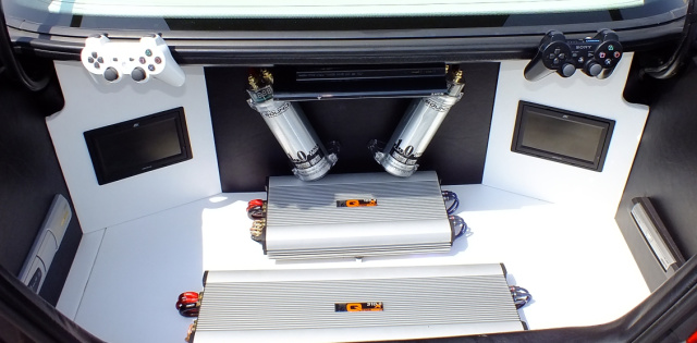Reichlich vom Leder zog Thomas auch bei der Umgestaltung des Kofferraums. Selbiger hat als Gepäckabteil längst ausgedient und beherbergt nunmehr die Bausteine des reichhaltig bestückten Incar-Entertainments. Mit Alpine-Headunit, zwei Steg-Endstufen, Audio System-Lautsprechen, Krypton-Woofer, DVD-Player, Sony Playstation und fünf Monitoren bietet der Mercedes das volle Multimedia-Programm.