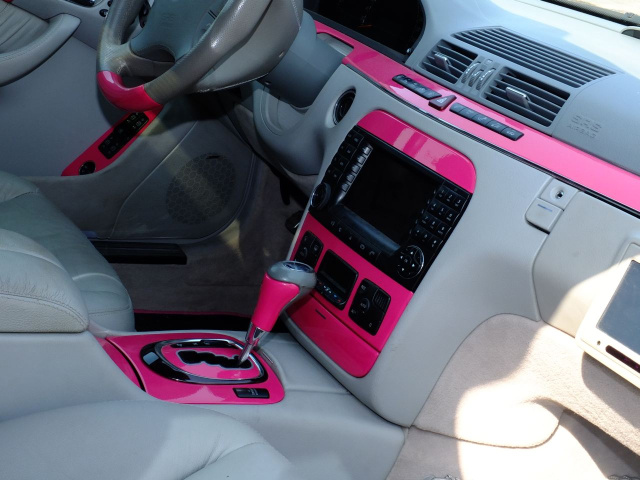 Infolge einer Modifikation des Hydraulikfahrwerks liegt der Benz schön tief auf dem Asphalt. Barracuda-Voltec-Räder in 8,5 x 19 vorn und 9,5 x 19 hinten füllen die Radhäuser bis zum Rand. Im Bicolor-Look drehen sich die Felgen, die mit 245/35 zw. 275/30er Kumho Ecsta SPT gefahren werden, um die Achsen. Während die Y-Speichen des Räder in Hochglanzschwarz lackiert sind, wurde das Felgenbett – man ahnt es schon – in Pink koloriert. Rosa begegnet dem Betrachter auch im Innenraum. Mit dieser Farbe sind nämlich auch das Dekor und Teile des Lenkrads belegt.