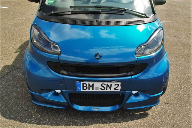 Als „einzig...aber nicht artig“ pries Autoveredler Lorinser im Prospekt sein Zubehörprogramm für den smart 451 an. Das war nicht zu viel versprochen, denn von der milden Sorte ist die Optik eines smart Lorinser nicht. Markante Schürzen, wuchtige Verbreiterungen und eine gewaltige Vergrößerung der Spur um 110 mm - dieses heiß aufbereitete und scharf abgeschmeckte Menü gefiel dem Koch, der mit seinem smart als gepfefferter Pistenschreck und nicht als smoother Suppenkasper ums Eck kommen wollte. Das Lorinser-Optik-Menü garnierte Ingo individuell noch mit Brabus-Scheinwerfern und Carbon-Scheinwerferblenden.