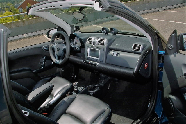 Der flotte Eindruck, den das Exterieur des smart auf den Betrachter macht, setzt sich im Innenraum fort. Der Brabus-Schaltknauf mit Startknopf, die Lorinser.Pedale, das Lorinser-Akzent-Teileset in Carbon-Optik sowie Nappalederbezüge mit blauen Nähten für Sitze und Lenkrad wissen zu gefallen und betonen die sportive Bestimmung des smart. Fazit: Der smart Ingo steht stramm da und gehört zur flotten Truppe!