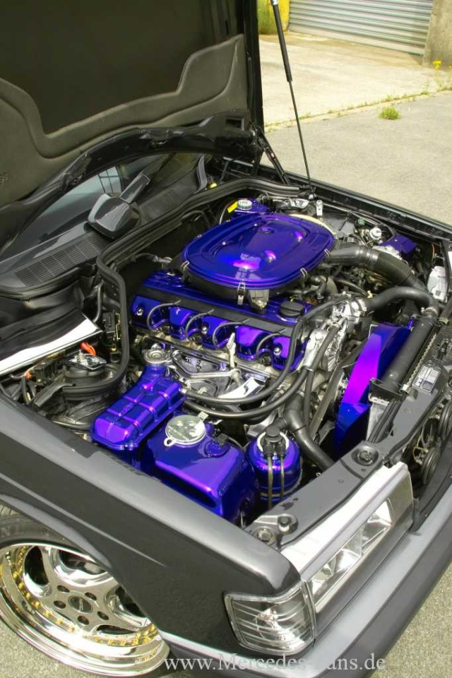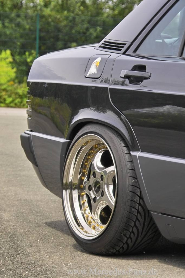 Peter Flottmann zählt zu den Mercedes-Fans, die den W201 nicht bloß als ein nahezu unverwüstliches Automobil schätzen, sondern in ihm eben auch einen erhaltungswürdigen Meilenstein der Firmengeschichte sehen. Folgerichtig schenkt er dem Mercedes die Hege und Pflege, welche die Baureihe ganz gewiss verdient. Die hohe Wertschätzung, die der Mercedes-Fan dem 190er entgegenbringt, hält Peter freilich nicht davon ab, bei Gestaltung und Setup eigene Akzente zu setzen. Und wie man sieht, steht dem W201 ein bisschen Bling-Bling durchaus gut zu Gesicht.