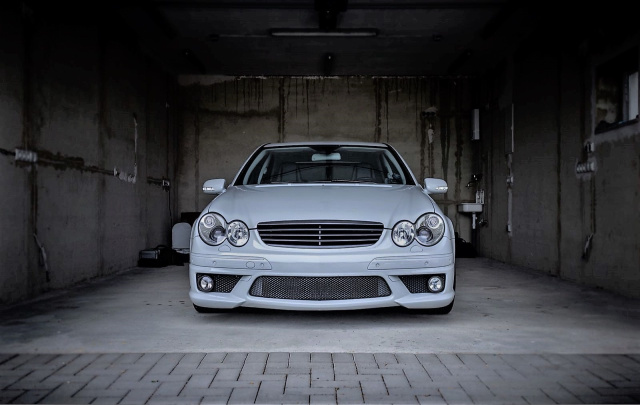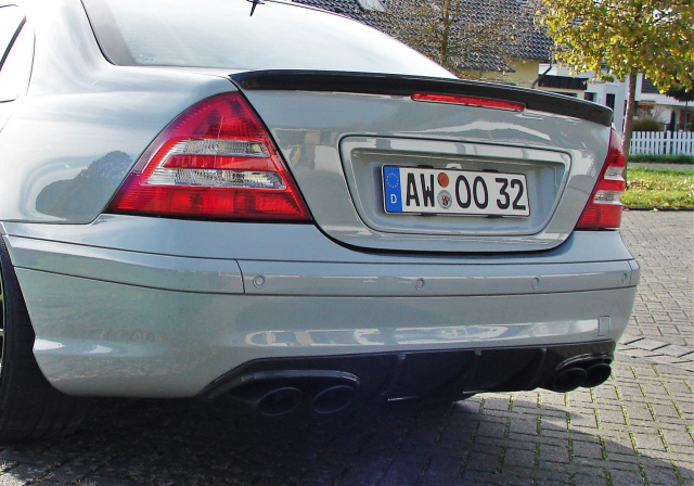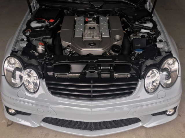 Karosserie: Lackierung in Porsche Classic-Grau (Porsche L63A), sämtliche Chromleisten entfernt oder durch Leisten ohne Chrom ersetzt, Mercedes-Sterne vorn und hinten entfernt, CLK63-AMG-Front, C55-AMG-Abrisskante, Echtcarbon-Laminat für Wischer, Fensterrahmen, Grill, Diffusor, Wasserablauf, Dachabschlussleisten, W211-Mopf-Außenspiegel
