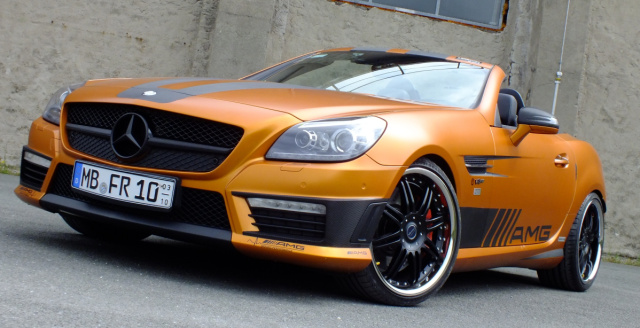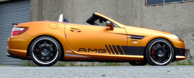Bezüglich der Linienführung setzt Franz auf die markante Silhouette des Mercedes SLK 55 AMG. „Front- und Heckschüze mit Diffusor-Einsatz, Seitenschwellerleisten sowie die Abrisskante auf dem Heckdeckel stehen dem Roadster hervorragend“, urteilt der Bayer zufrieden. „Lediglich das Topping wünschte ich mir spürbar sportlicher und sichtlich individueller.“ Daher ordnete Franz eine Folierung in “Canyon Copper Matt“ an.
