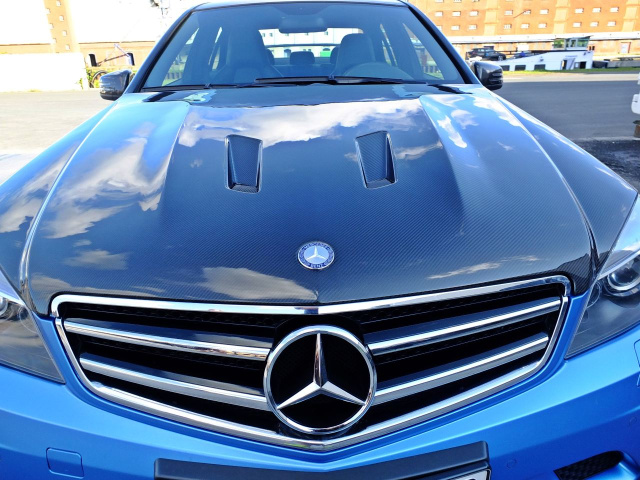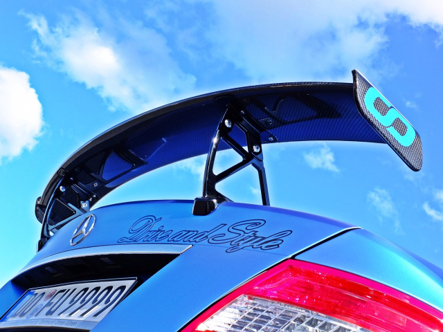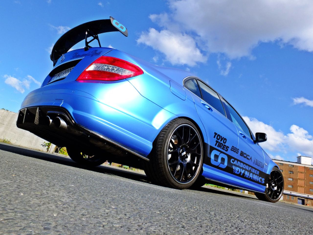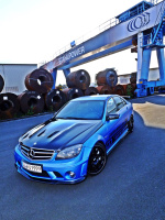 Um den Hinguckereffekt des C63 AMG zu steigern, setzt man beim aktuellen Projektauto aber nicht nur alles auf die Carbon-Karte. Schön anzusehen ist ja auch die Folierung des eigentlich silber lackierten W204 in matt glänzendes Avus-Blau (Drive and Style).