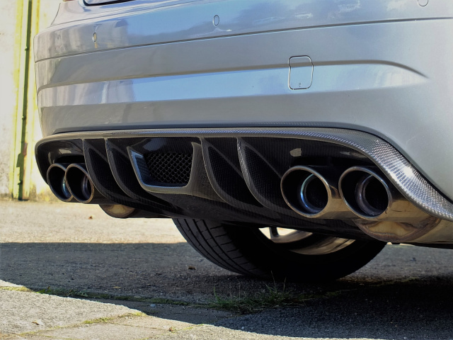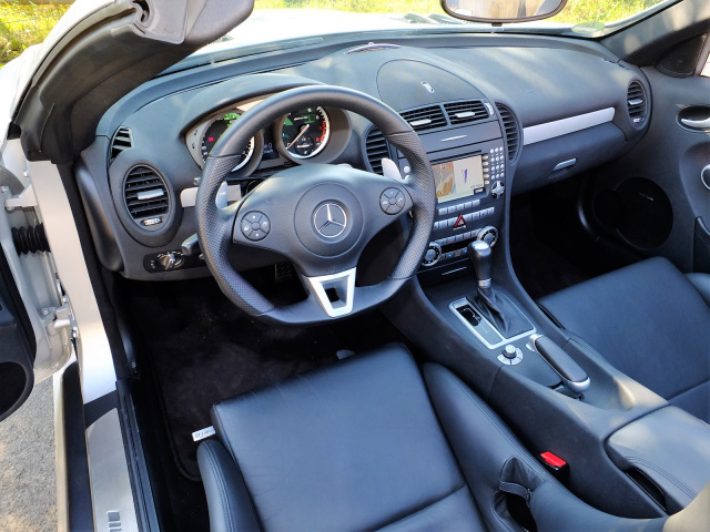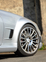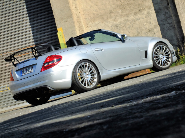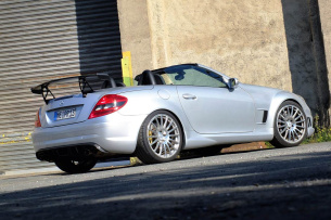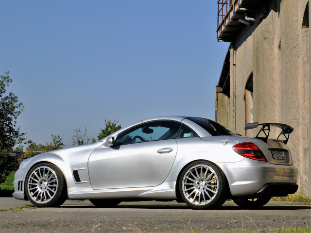 Weitere Veränderungen an den Äußerlichkeiten liegen in Form einer Carlsson-Frontschürze mit AMG Black Series-Lufteinlässen und einem Piecha Design Carbon-Heckdiffusor vor. Im Innenraum verändern leichtere Sitze vom C63 Black Series und ein 2008er Performance-Lenkrad mit Aluminium-Schaltwippen das werksseitige Setup des Mercedes-Benz SLK 55 AMG.