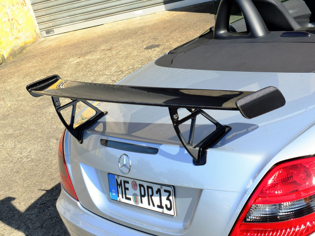 Nicht nur bei den Schmiederädern wird Gewicht gespart. Dank der Verwendung von Black-Series-CFK-Kotflügeln und einem Carbon-Klappdach, das es laut Peter Röskes nur einmal auf dieser Welt gibt, und einer Braille Lithium/Ionen Batterie in der Reserveradmulde, speckt der SLK weitere Kilos ab. Ein bisschen extra Gewicht hat Peter allerdings durch die Montage eines C63-Black-Series-Heckflügel - auch dieses Bauteil, so sagt Peter, sei einmalig für einen SLK - draufgesattelt. Im Gegenzug für diese Maßnahme hat er sich etwas mehr Anpressdruck eingehandelt.
