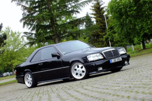 Der Vorbesitzer hatte dem Mercedes bereits eine komplette Neulackierung in Tiefschwarz gegönnt, erläutert Kevin. Lediglich an ganz wenigen Karosseriestellen gibt es überschaubaren Bedarf für kleine Schönheitsreparaturen. Ergänzend kleidet der Coupé-Chauffeur die C124-Karosserie in den markanten AMG-Look (Mopf 1). MAE-Felgen runden den stylischen Auftritt des Mercedes, der von einem 220 PS starken Sechszylinder befeuert wird, ab.