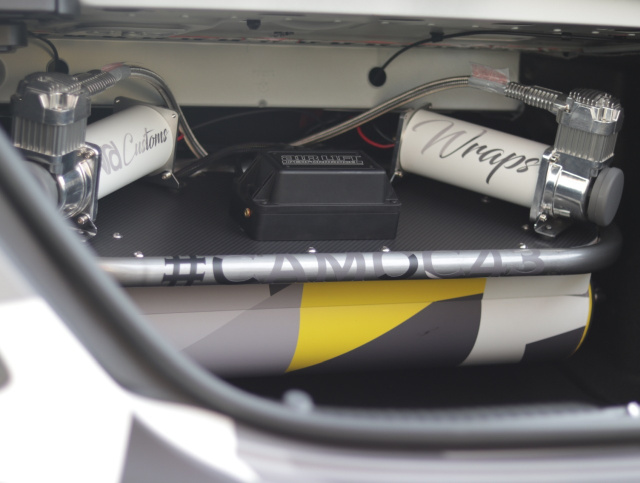 Besser gelungen schaut für uns der Kofferraumausbau mit Lufttank und Kompressor aus. Die Installation ist hier in einer Weise aufbereitet worden, dass sie mit dem Camo-Look der Karosserie kongenial korrespondiert. (Bilder: VRD Customs)